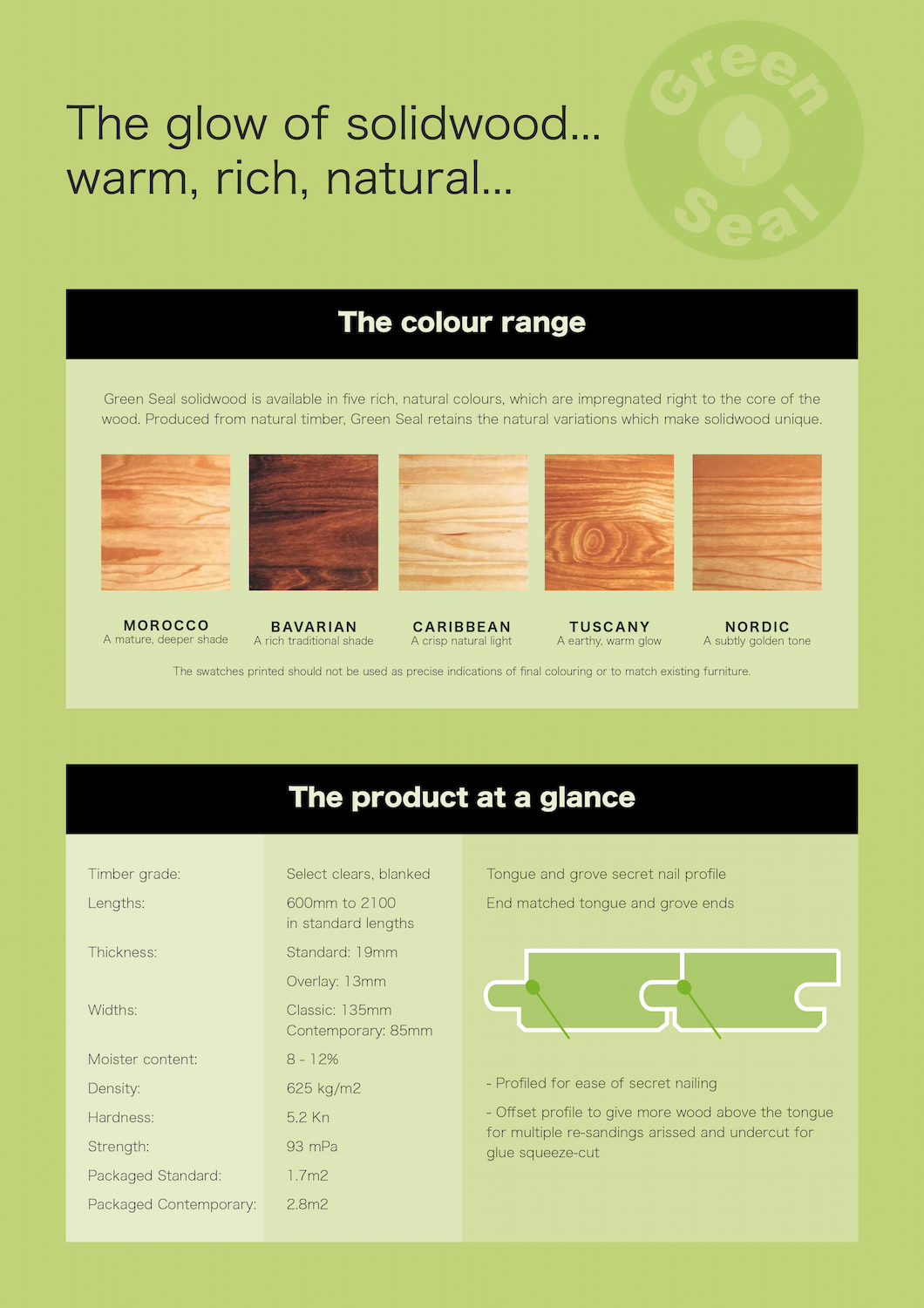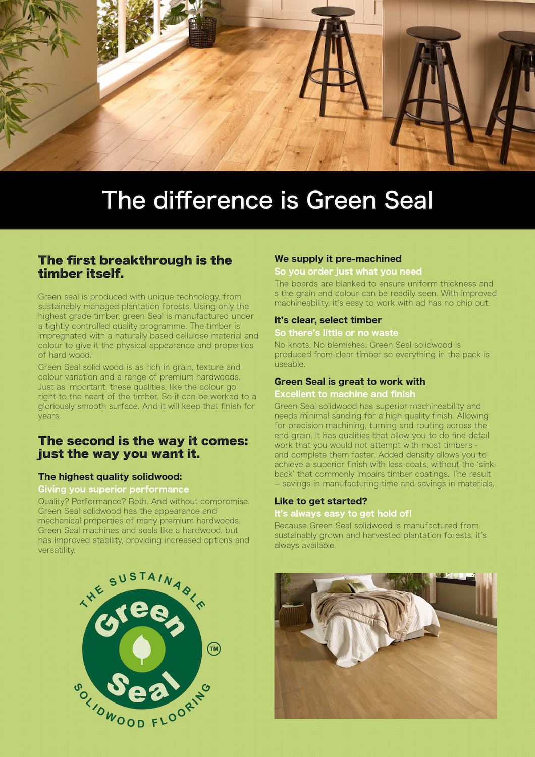 Our client produces an eco-friendly, sustainable solidwood with all of the properties of a premium hardwood. They identified that they need to revitalise the name and identity of their product. They needed a new brand which reflected the values of their product and was more appealing their identified target market (middle income, 30+ years, eco-conscious). We created the Green Seal brand which expresses these properties, and extended the brand across packaging, stationary, point of sale support, trade materials and press advertising.