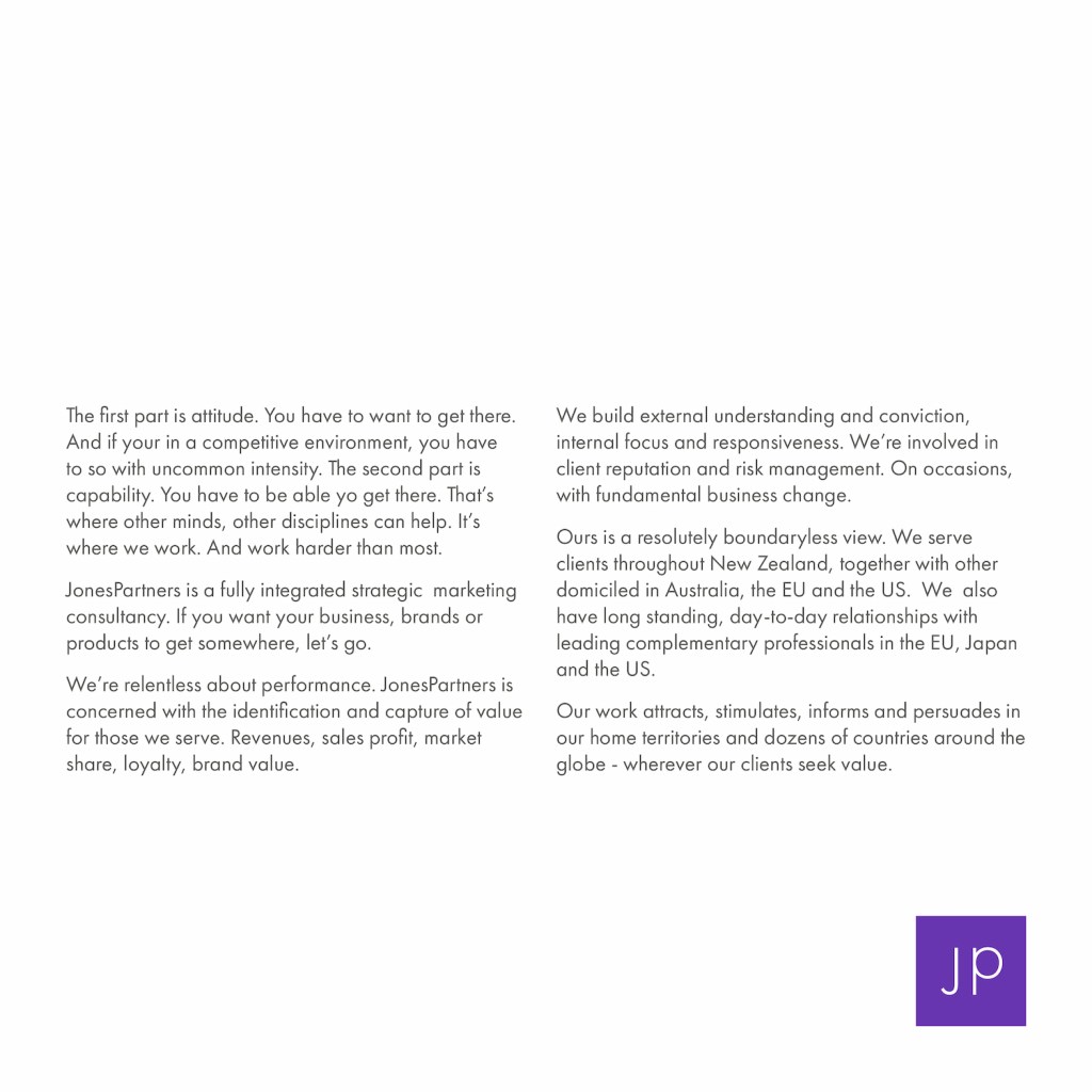 JonesPartners wanted to freshen their brand identity, but still keep a simple, clean and professional look. We wanted to keep the company name and related equity, but wanted to lighten the seriousness of the old livery, reflecting more of JP’s simple creativity and flair.